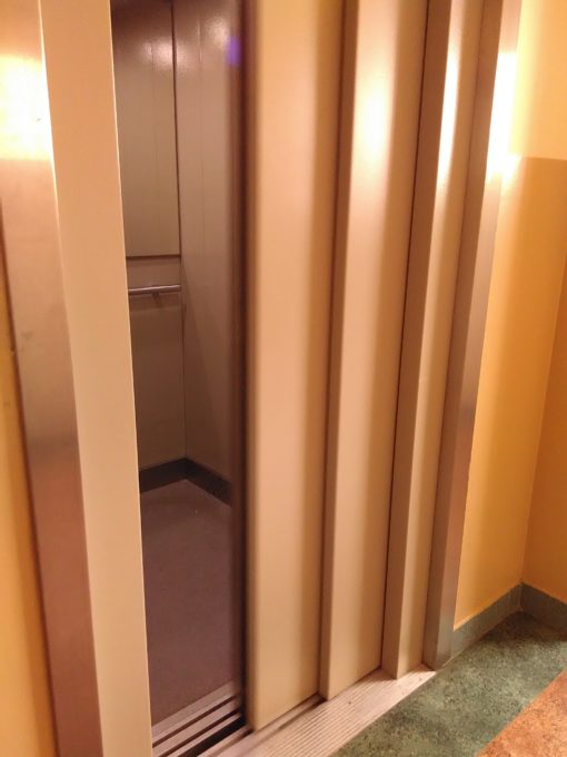 Na zdjęciu – drzwi tej windy cofały się przy każdej próbie zamknięcia. I tak przez wiele godzin…