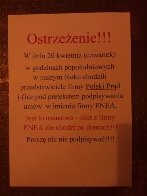 Pani Danuta napisała: „Oszuści akwizytorzy działają w domach konsumentów. Klienci to osoby w wieku senioralnym. Przedstawiciele „spółki” najczęściej nie informowali, jaką firmę rzeczywiście reprezentują. Sugerowali, że działają w imieniu dotychczasowego sprzedawcy. Konsumenci podpisując dokumenty, nie wiedzieli, że zmieniają sprzedawcę prądu. Akwizytorzy manipulowali informacjami o niższych rachunkach za energię elektryczną, m.in. nie informując o obowiązku opłacania comiesięcznej opłaty handlowej. Sugerowali, że rachunki za prąd będą niższe, a w efekcie we wprowadzonych w cennikach stawkach progresywnych, cena energii rosła z roku na rok. Ponadto nie informowali klientów o konieczności opłaty dwóch rachunków za dystrybucję i sprzedaż energii. Nie zostawiali klientom podpisanych dokumentów lub zostawiali nieczytelnie wypisane), nie informowali o prawie odstąpienia od umowy i nie zostawiali wzoru formularza o odstąpieniu od umowy. Jeśli podpisaliście taką umowę, trzeba w ciągu 14 dni odstąpić od niej. Jeśli nie macie umowy, należy niezwłocznie skontaktować się ze swoim dotychczasowym dostawcą prądu. A przede wszystkim LEGITYMOWAĆ AKWIZYTORÓW, czy są tymi, za których się podają”.