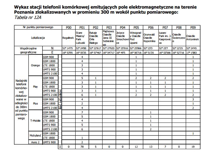 „Poznań 0.71 V/m co stanowi 10.1% wartości dopuszczalnej. Wartość najwyższą promieniowania elektromagnetycznego wynoszącą 1,63 V/m zarejestrowano w punkcie pomiarowym P05 – Winogrady – Osiedle Pod Lipami, ul. Karbowska. Wartość najniższą promieniowania elektromagnetycznego na poziomie poniżej 0,20 V/m zarejestrowano w dwóch punkach pomiarowych: P00 – Rogalinek, teren nad Wartą oraz P08 – Osiedle Świerczewo, ul. Bohaterów Westerplatte.”